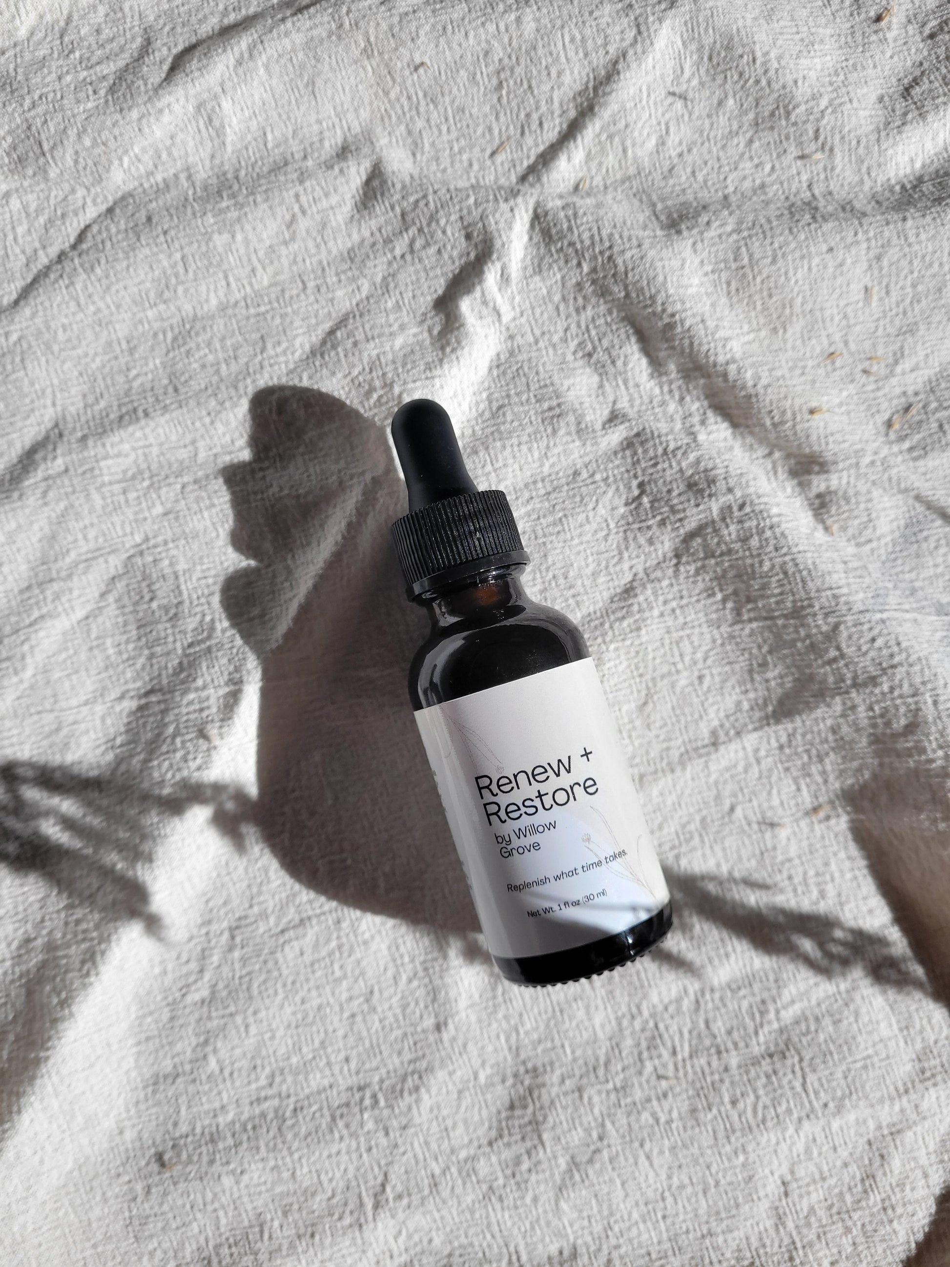 Restore your skin’s youthful glow with our nutrient-rich Renew + Restore Serum, thoughtfully crafted to combat signs of aging like wrinkles, dark spots, and uneven texture. This lightweight blend combines potent botanical oils. Hemp seed, squalane, tamanu, pomegranate seed, buckthorn, rosehip, and rich grass-fed tallow to deeply nourish, hydrate, and rejuvenate your complexion.